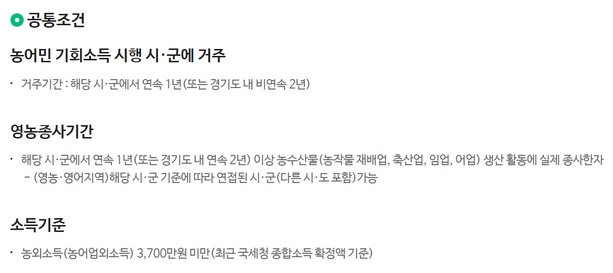 | 공통 조건 | 해당 시군에 연속 1년 이상 또는 경기도 내 비연속 2년 이상 거주, 연속 1년 이상 영농·영어에 종사, 농외소득 3,700만 원 미만 | 해당 유형에 따라 월 5만 원 또는 15만 원 지역화폐 지급 |